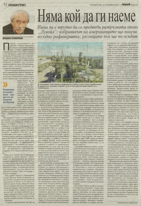 През последните седмици от ППДБ се зазяпаха в датата 21 ноември, дъвчеха я и я ослюнчваха до премала – и накрая се оказа, че една седмица преди въпросната дата американците ни предоставиха уж невъзможната дерогация за „Лукойл“. И това се оказа неочаквано главно за кандидат-наемниците, тия хора нямат достъп до сериозни източници – и то тъкмо в „храма“, в който се предполага, че се кръстят най-усърдно. Никой не ги взема на сериозно.