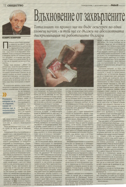 През 2002 година показах във „Всяка неделя“ на Горбачов една знаменита карикатура от списание „Шпигел“, която представяше съветския лидер като просяк, разчитащ единствено на подаяния. Тогава, при всичките ми съмнения, не бях все още напълно убеден, че от години и ние окончателно сме приели да играем тази роля, сякаш не ставаме вече за нищо друго, всяка друга роля ще изглежда неподходяща за нас. И дори не си правим труда да просим по-убедително - милиарди ни бяха отнети от Евросъюза заради некадърността на бюрократите ни, които не успяваха да подготвят нужните документи – а всъщност прошения – за Плана за устойчивост и развитие. Споменатите бюрократи да не ги мислим, те все ще успеят да се накрадат и по друг начин. Тоталният ни провал ще ни бъде осигурен по един зловещ начин - и той ще се дължи на абсолютната дискриминация на работещите българи.