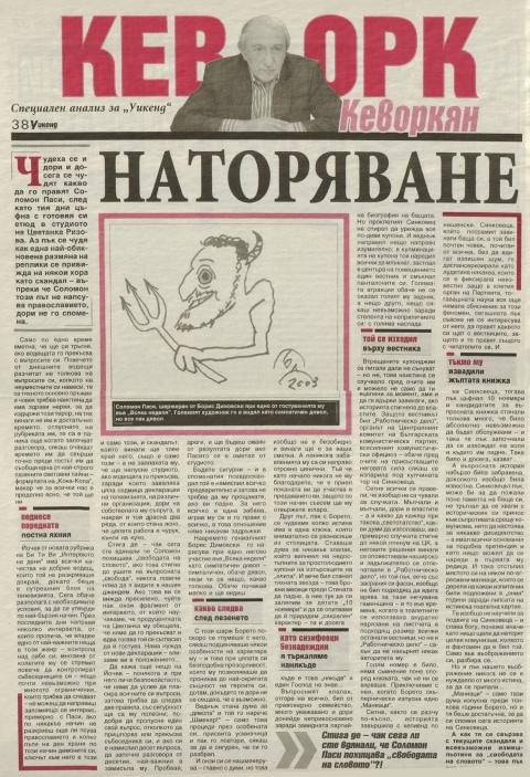 Само по едно време вметна, че ще си тръгне, ако водещата го прекъсва с въпросите си. Повечето от днешните водещи разчитат не толкова на въпросите си, колкото на неуместните си намеси, те са тяхното основно оръжие и човек трябва наистина да има здрави нерви, за да издържи този терор; на тях винаги не им е достатъчно времето, отпуснато на рубриката им, те са в паника, още когато започват разговора, сякаш очакват времето им да свърши, точно преди гостът им да съобщи една от най-строго пазените световни тайни – формулата на Кока-кола, макар че за всички нас е пределно ясно, че той ще ни поднесе поредната постна яхния. Йочев, от новата рубрика на Би Ти Ви „Интервюто на деня“, има всички качества на добрия водещ, които той не разкриваше докрай, докато беше в сутрешния блок на телевизията. Сега обаче разполага с всички условия, за да се утвърди по най-бързия начин. През последните дни направи няколко интервюта, от които пролича, че владее едно от най-важните неща в този жанр – контрола над себе си; мнозина от колегите му се стремят повече да контролират събеседниците си – нещо почти невъзможно при многото ограничения, които трябва да следват – не можеш да направиш запомнящо се интервю, примерно с Паси, ако по някакъв начин не разкриеш още ли псува православието и колко пъти на ден храни по този начин демоните си, ключът към него е този и само този, и скандалът, който винаги ще тлее край него, също е само този – а не заплахата му, че ще напусне студиото, ако водещата го прекъсва, заради което заваляха цяла седмица декларации на телевизията, на различни организации, дори на собствената му съпруга, а накрая и той драсна два реда, от които стана ясно, че цялата работа е чурук, кънти на кухо. Стига де – чак сега сте вдянали, че Соломон похищава „свободата на словото“, ако това стигне до ушите на въпросната „свобода“ никога повече няма да я видите в нашия джендем. Ако това ви се вижда пресилено, чуйте пак онзи фрагмент от интервюто, от който научаваме, че продуцентката на Цветанка му обещала, че няма да го прекъсват и едва тогава той се съгласил да й гостува. Няма нужда от нови декларации – влизаме ви в положението…