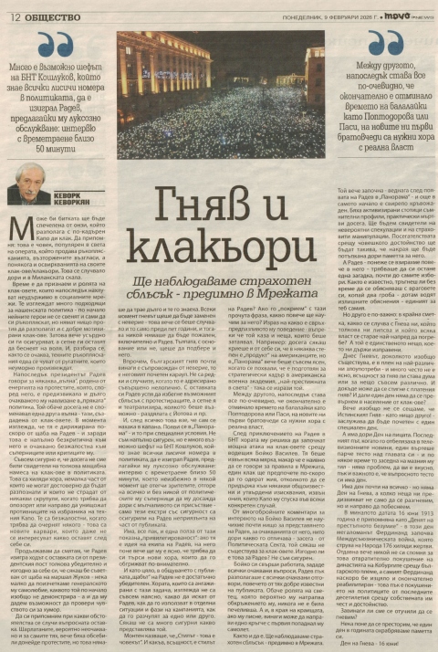 Както и да е. Ще наблюдаваме страхотен сблъсък – предимно в Мрежата. Той вече започна – веднага след появата на Радев в „Панорама“ - и още в самото начало е свирепо кръвожаден. Бяха активизирани стотици съмнителни профили, практически мъртви досега. Ще бъдем свидетели на невероятни спекулации и на страховити манипулации. Посегателствата срещу човешкото достойнство ще бъдат такива, че накрая ще бъде потъпкана дори паметта за него.