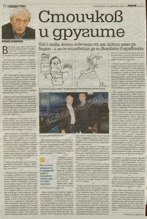 В архива на „Всяка неделя" има две наистина гениални рисунки на Борис Димовски. Не се подвеждайте - Борето е обкичил с лавров венец левия крак на Стоичков, но той го ценеше много и като човек.