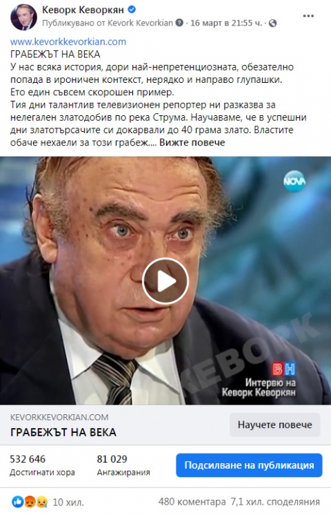Тия дни талантлив телевизионен репортер ни разказва за нелегален златодобив по река Струма. Научаваме, че в успешни дни златотърсачите си докарвали до 40 грама злато. Властите обаче нехаели за този грабеж.